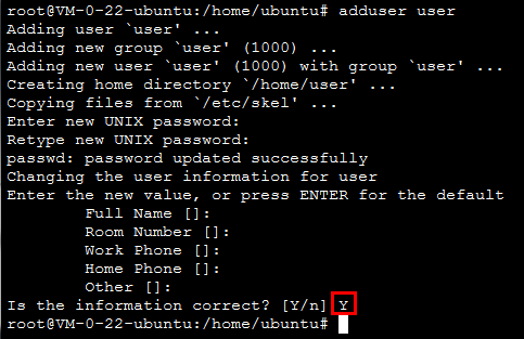 5. Yを入力して情報を確認し、Enterを押すと設定が完了します。下図に示します。