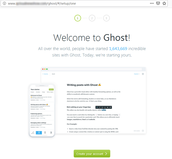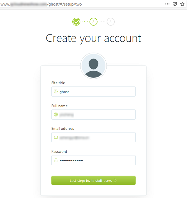 7. ローカルブラウザを使用して、Ghostの管理者アクセス用アドレスにアクセスし、個人ブログの設定を開始します。下図に示します。