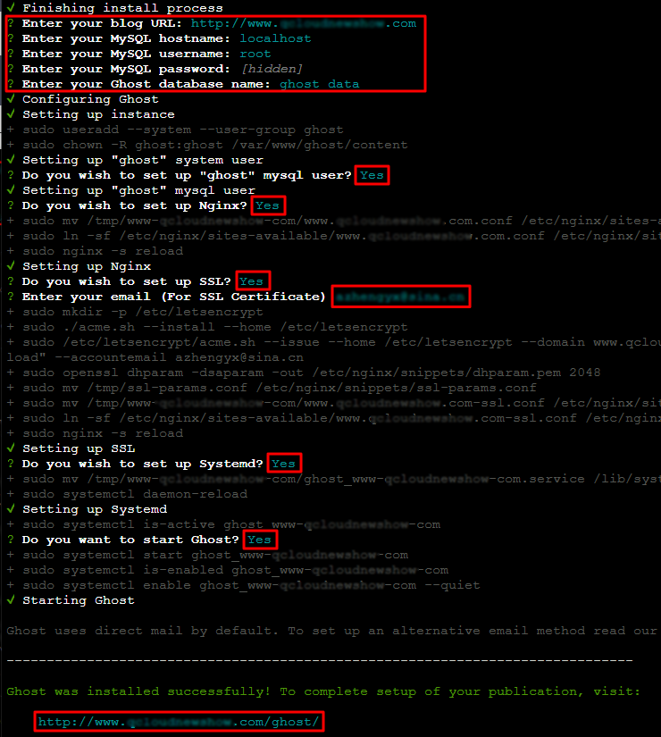 4. Enter your MySQL password:データベースのパスワードを入力します。 rootアカウントのパスワード設定 で設定済みのパスワードを入力し、Enterを押してください。 5. Enter your database name:Ghostで使用するデータベースを入力します。 データベースの作成 で作成済みのghost_dataを入力し、Enterを押してください。 6. Do you wish to set up SSL?:HTTPSアクセスを有効にしたい場合はYを入力し、Enterを押してください。