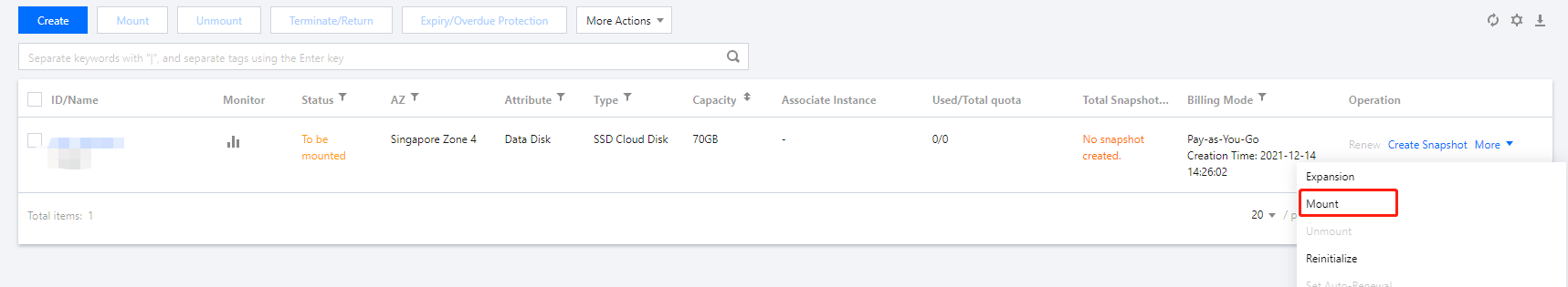 3. マウントしたいWindowsデータディスクを選択し、その他 > マウントをクリックします。以下の通りです。