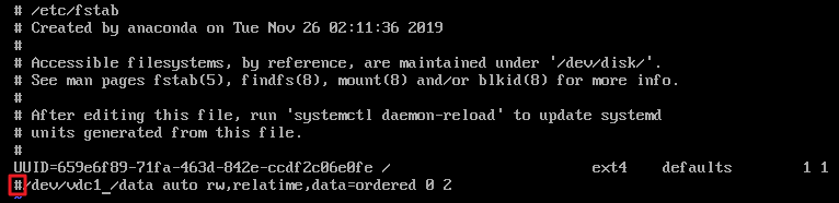 /etc/fstabファイルを開きます。vi /etc/fstab