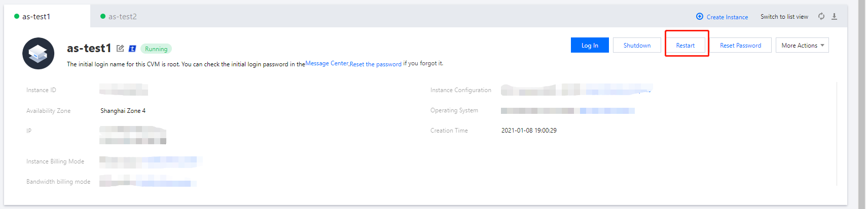 再起動の操作方法:インスタンスで再起動コマンド(たとえば、Windowsでの再起動コマンドやLinuxでのRebootコマンドなど)を実行する代わりに、Tencent Cloudが提供する再起動操作を使用してインスタンスを再起動することを推奨します。