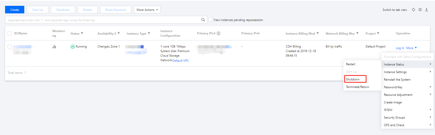 タブビュー:下図のように、シャットダウンしたいインスタンスのページで、画面の右上隅にあるその他の操作>インスタンスの状態>シャットダウンをクリックします。
