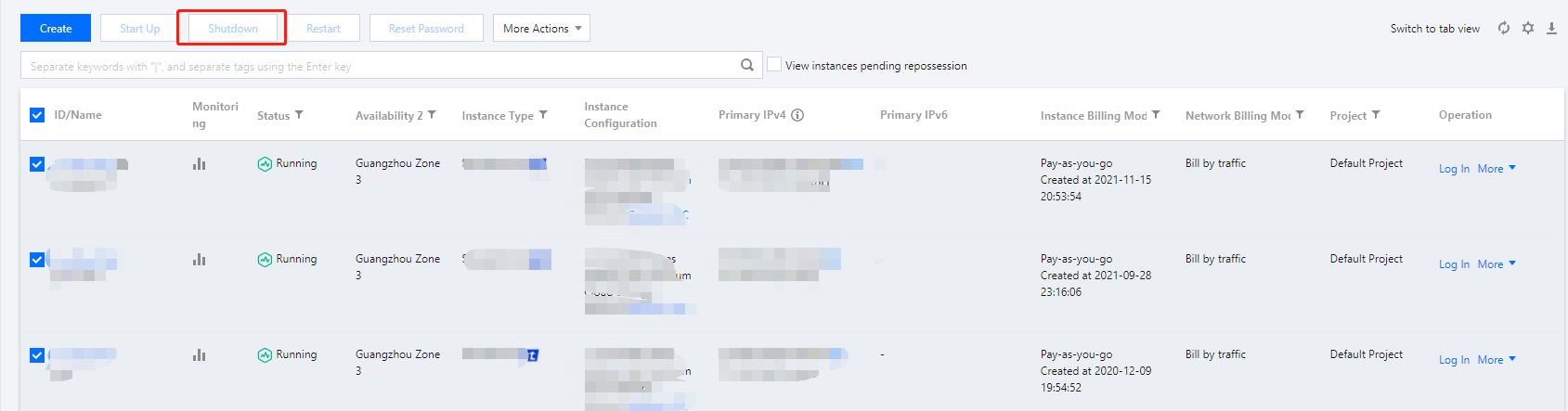 2. 下図のように、シャットダウンするすべてのインスタンスを選択し、リストの上部にあるシャットダウンをクリックすれば、インスタンスを一括シャットダウンできます。