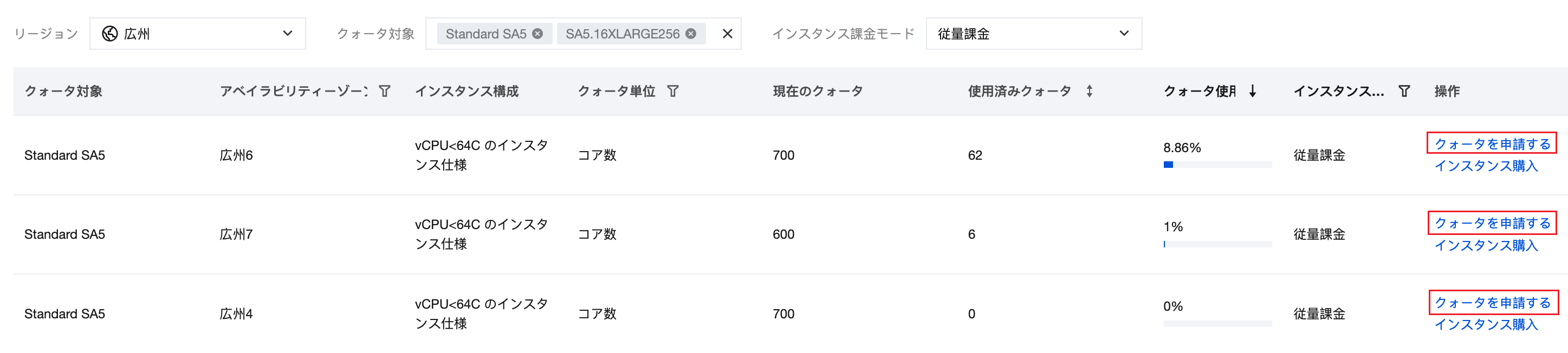 2. インスタンスクォータページで、リージョン、アベイラビリティーゾーン、および課金方法を選択してフィルタリングし、クォータ情報を迅速に特定します。