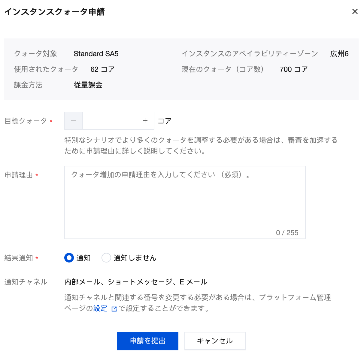 4. クリックするとインスタンスクォータ申請ポップアップが開き、目標クォータと申請理由を記入し、申請結果の通知の有無を選択します。