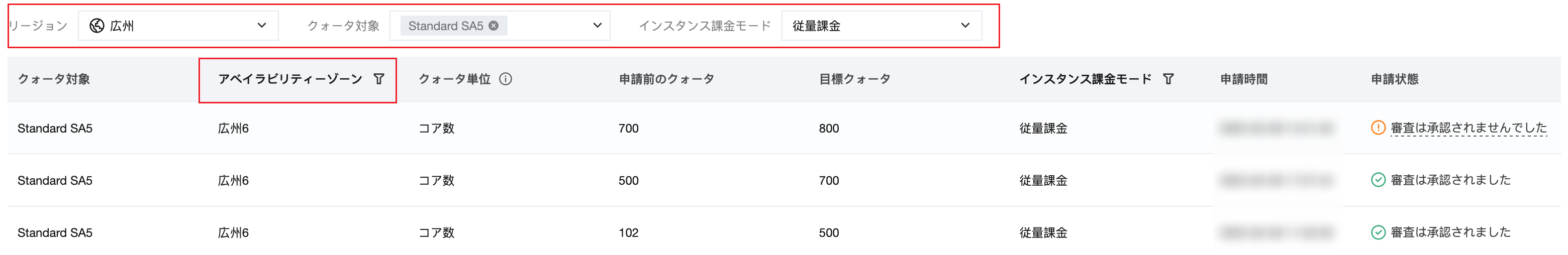 2. クォータ申請記録ページで、リージョン、アベイラビリティーゾーン、および課金方法を選択してフィルタリングし、クォータ申請履歴を迅速に特定し、クォータ申請の進捗状況と結果を確認します。