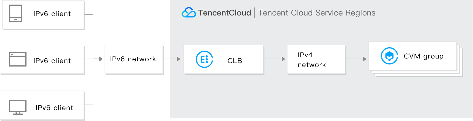 インターネットのIPv6ネットワークマクロ環境は構築の初期段階のため、SLA保障を提供していません。ネットワークにアクセスできない状態が発生した場合は、チケットを提出して、フィードバックしてください。 CLBはIPv6 NAT64 CLBインスタンスの作成をサポートしています。Tencent CloudはインスタンスにIPv6パブリックアドレス(すなわち、IPv6版のVIP)を割り当てます。このVIPはIPv6クライアントからのリクエストをバックエンドのIPv4 CVMに転送します。