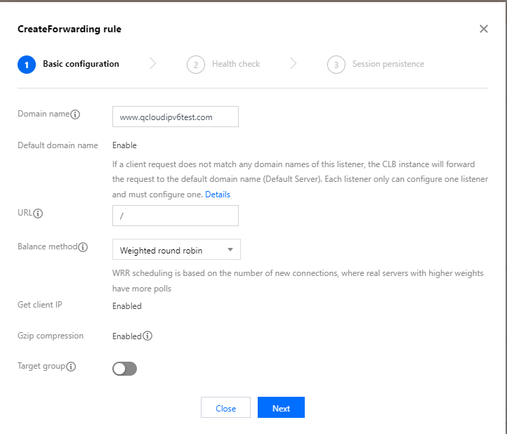 2. ポップアップボックスで、ドメイン名、URLパス、バランシング方式を設定し、次へをクリックします。