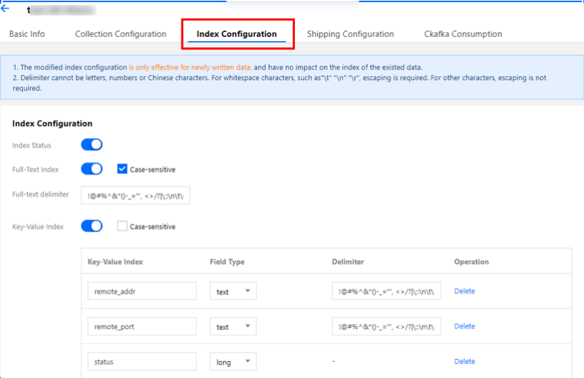 キー値インデックス | フィールドタイプ | 区切り文字 |