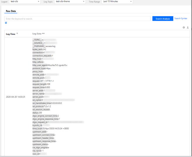request_time | リクエストの処理時間です。クライアントからの最初のバイトの受信時から、クライアントに最後のバイトを送信するまでの時間です。クライアントリクエストがCLBに到着し、CLBがリクエストをRSに転送し、RSが応答データをCLBに送信し、CLBがデータをクライアントに転送するまでのすべての時間が含まれます。単位: 秒。 | double |