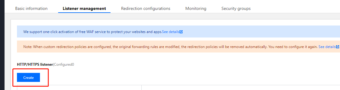 3. 「リスナー管理」タブの「HTTP/HTTPSリスナー」エリアで、新規作成をクリックします。 4. 「リスナーの作成」ダイアログボックスで以下の内容を設定し、完了後に送信をクリックします。