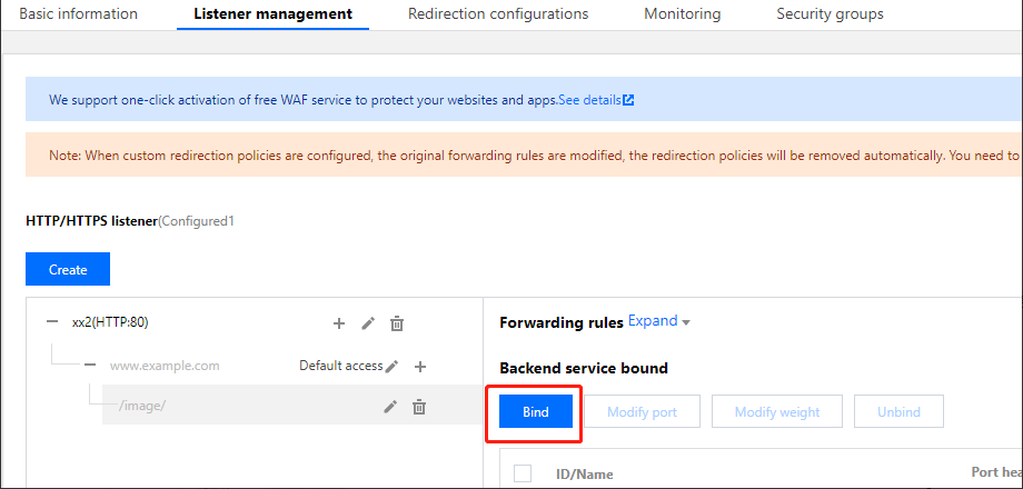 1. 「リスナー管理」ページで**+をクリックし、先ほど作成したリスナーを表示し、URLパスを選択し、右側の転送ルールの詳細**エリアでバインドをクリックします。