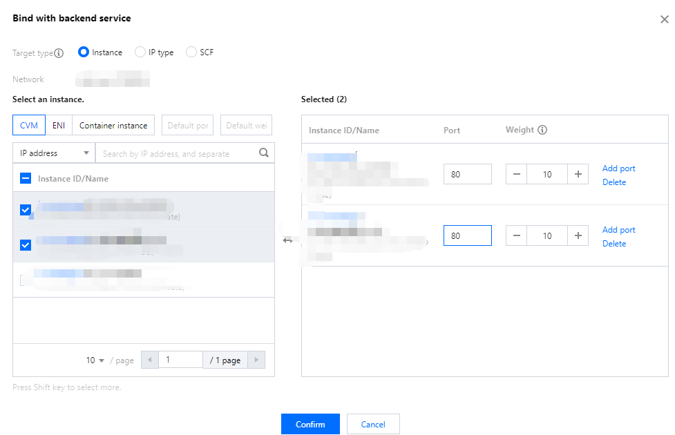 2. 「バックエンドサービスのバインド」ダイアログボックスで、バインドするインスタンスタイプに「CVM」を選択し、さらにCLBインスタンスと同一リージョンのCVMインスタンスrs-1とrs-2を選択します。CVMポートをどちらも「80」に設定し、CVMの重みをどちらもデフォルト値の「10」とし、確定をクリックします。