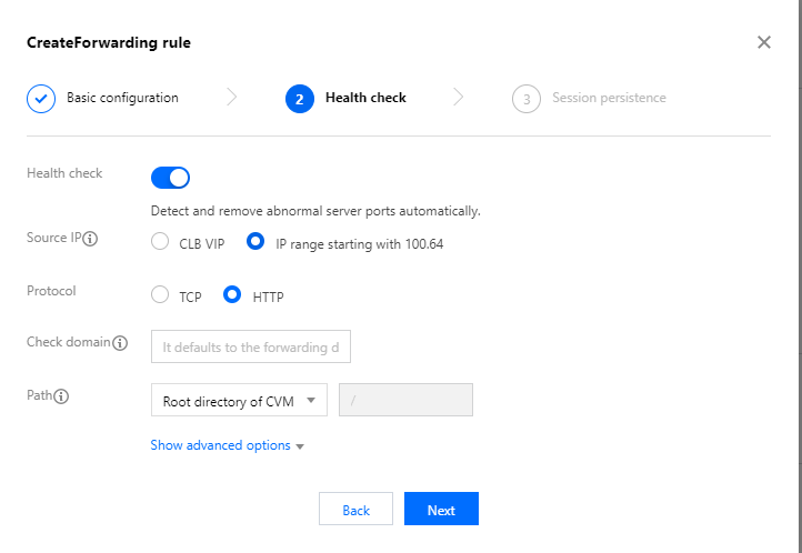 バランシング方式:「重み付けラウンドロビン」を選択します。詳細についてはバランシング方式をご参照ください。 3. 「ヘルスチェック」タブでヘルスチェックを有効にします。チェックドメイン名およびチェックパスはデフォルトの転送ドメイン名および転送パスを使用します。完了後に次へをクリックします。