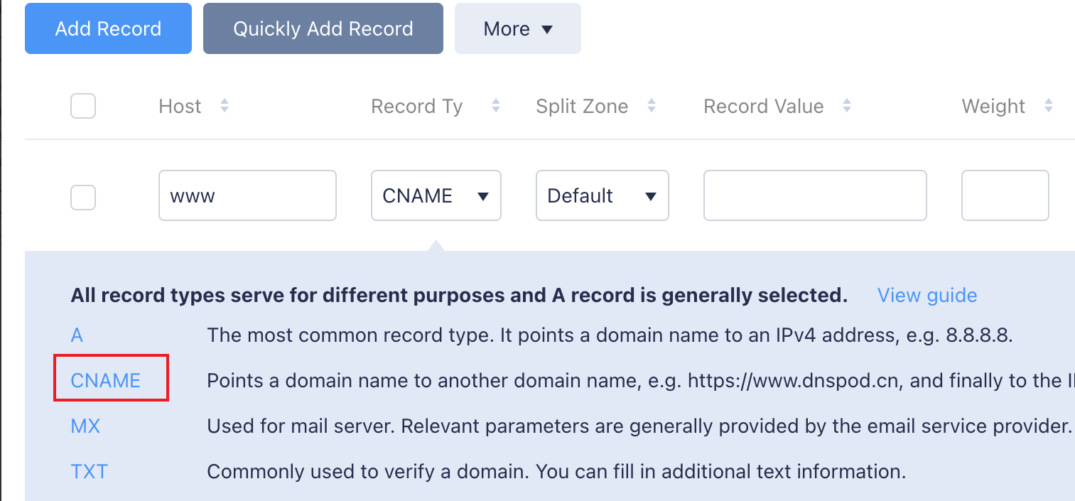 3.2 レコードタイプを選択します。CNAMEを選択することを推奨します。 3.3 回線のタイプを選択します。回線のタイプは指定回線のユーザーが該当ドメイン名にアクセスするためのものです。