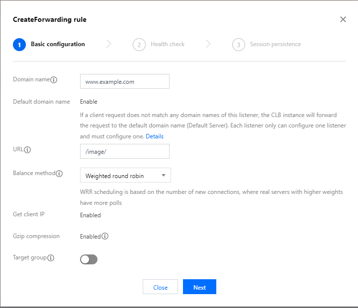 デフォルトドメイン名:クライアントリクエストがそのリスナーのどのドメイン名にもマッチしなかった場合、CLBはリクエストをデフォルトドメイン名(default server)に転送します。1つのリスナーに設定できるデフォルトドメイン名は1つのみです。このリスナーにデフォルトドメイン名が設定されていない場合、CLBは最初のドメイン名にリクエストを転送します。この例では設定しません。