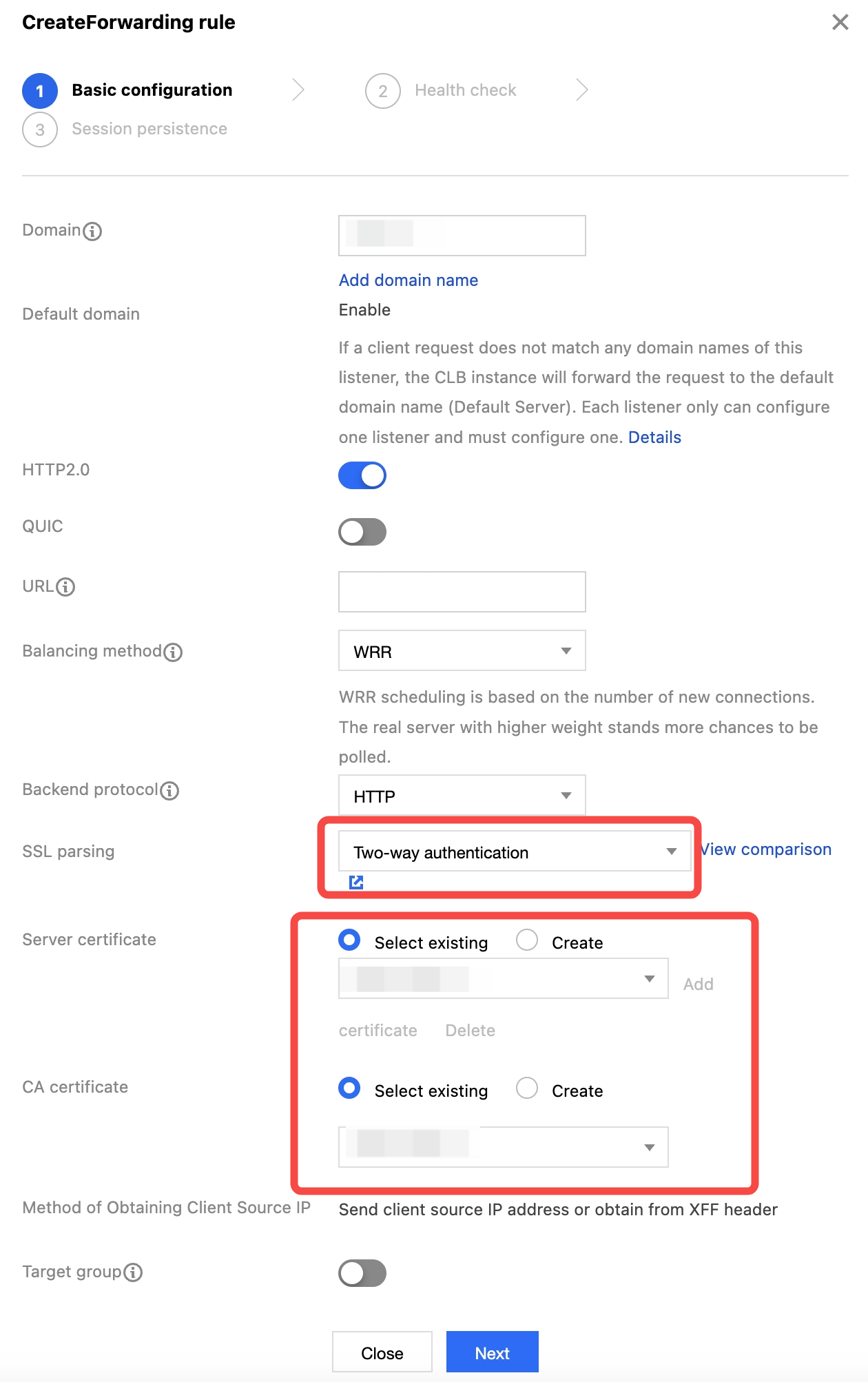 2. プラス記号をクリックして転送ルールを作成し、CLBのドメイン名とURLパスを入力し、バランシング方式とバックエンドプロトコルを選択して基本設定を完了します。そのドメイン名に対応するサーバ証明書と自己署名CA証明書を入力します。