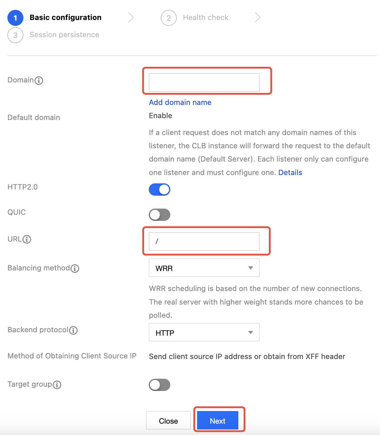 3. プラス記号をクリックして転送ルールを作成します。CLBのドメイン名とURLパスを入力します。バランシング方式とバックエンドプロトコルを選択して基本設定を完了します。