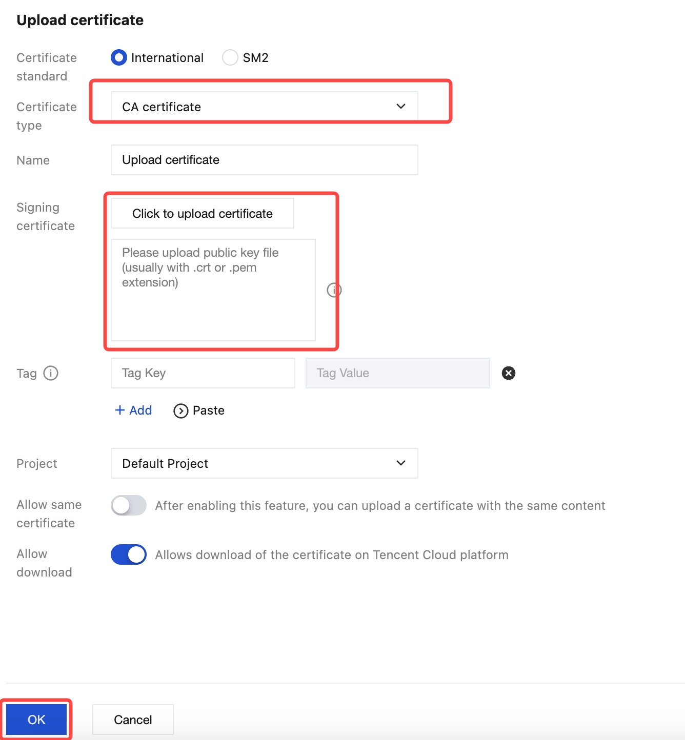 4. 証明書をアップロード:CA証明書を証明書プラットフォームにアップロードし、購入または自己署名サーバ証明書をアップロードする必要があります。