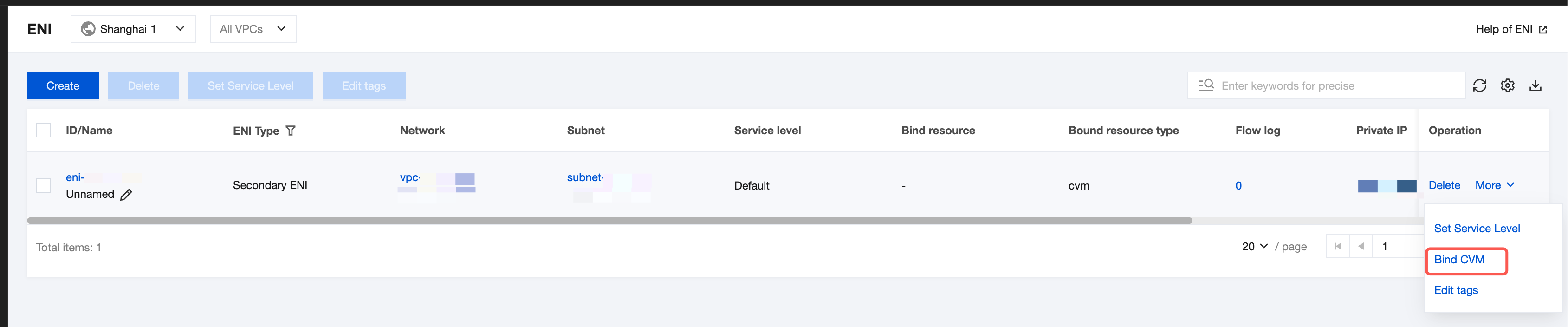 2. On the ENI list page, find the row of the ENI to be bound and configured, and choose More > Bind CVM in the Operation column.