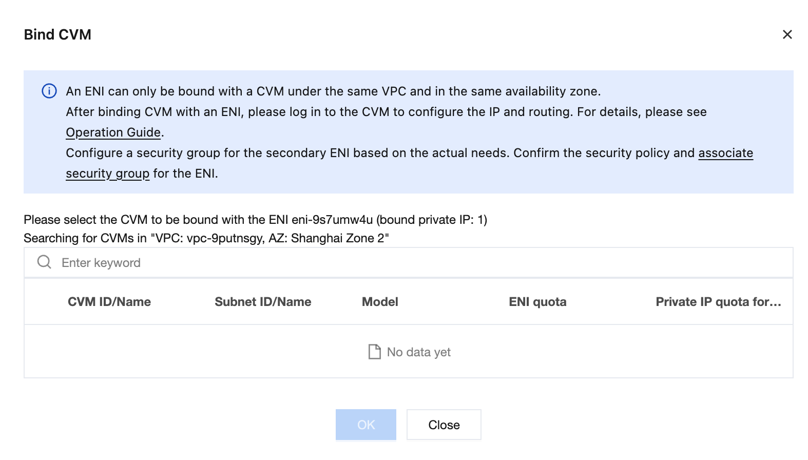 An ENI can only be bound to the CVMs in the same availability zone (AZ) as the ENI. For more information about instance type limits, see Use Limits. 3. In the Bind CVM dialog box, select the required CVM, and click OK to complete the binding operation.
