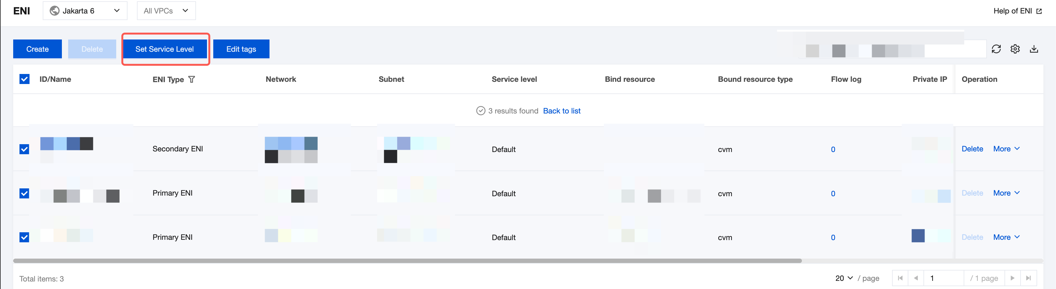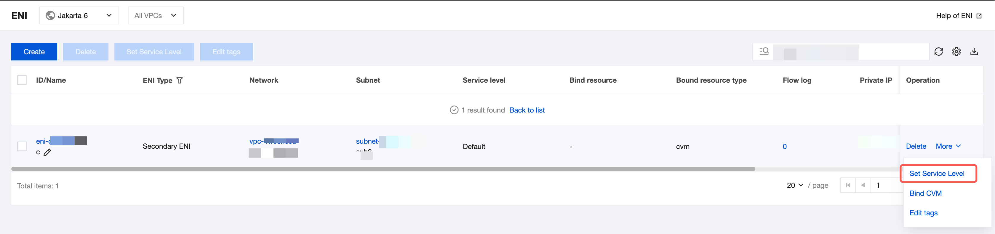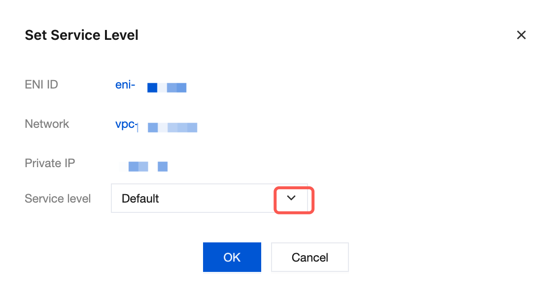 3. Find the row of the ENI for which you want to set the QoS level, and choose More > Set Service Quality Level in the Operation column.