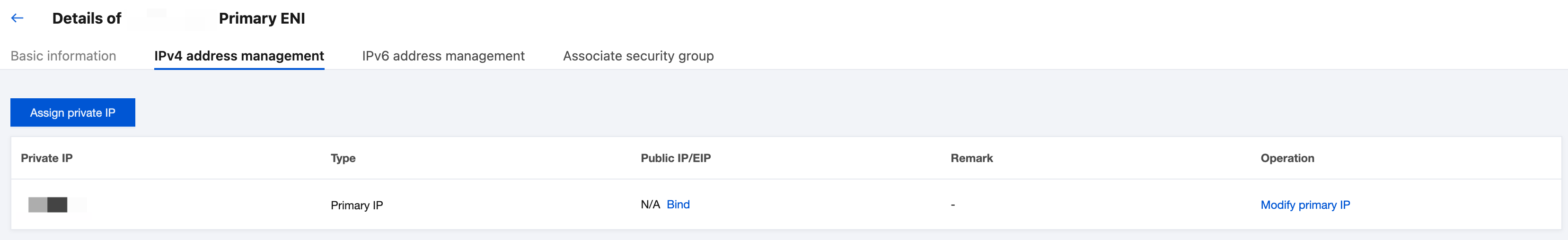 4. Click the IPv4 Address Management tab to view the bound primary private IP address.
