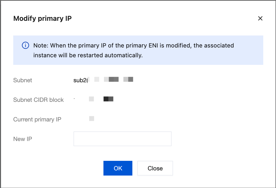 Modifying the primary private IP address of the primary ENI will cause the associated instance to automatically restart for about 30 seconds. A brief service interruption may occur during the restart process. Normal service will resume after the restart. Please proceed with caution based on your actual situation.