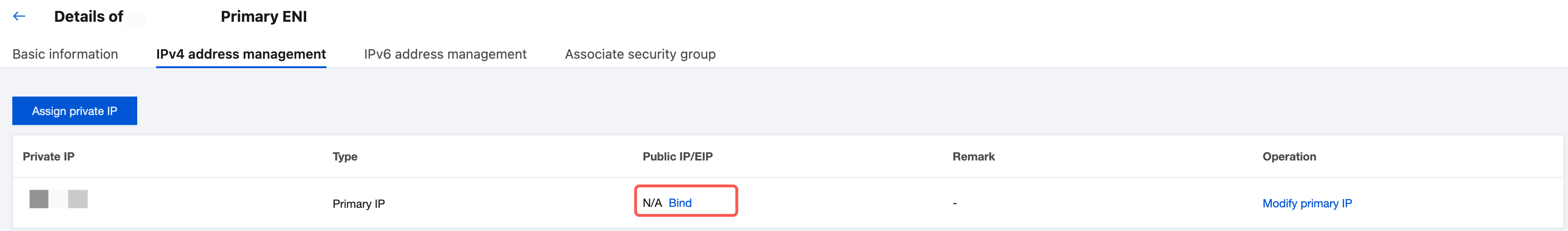 4. Locate the row of the private IP address that you want to bind and click Bind in the Public IP/EIP column.