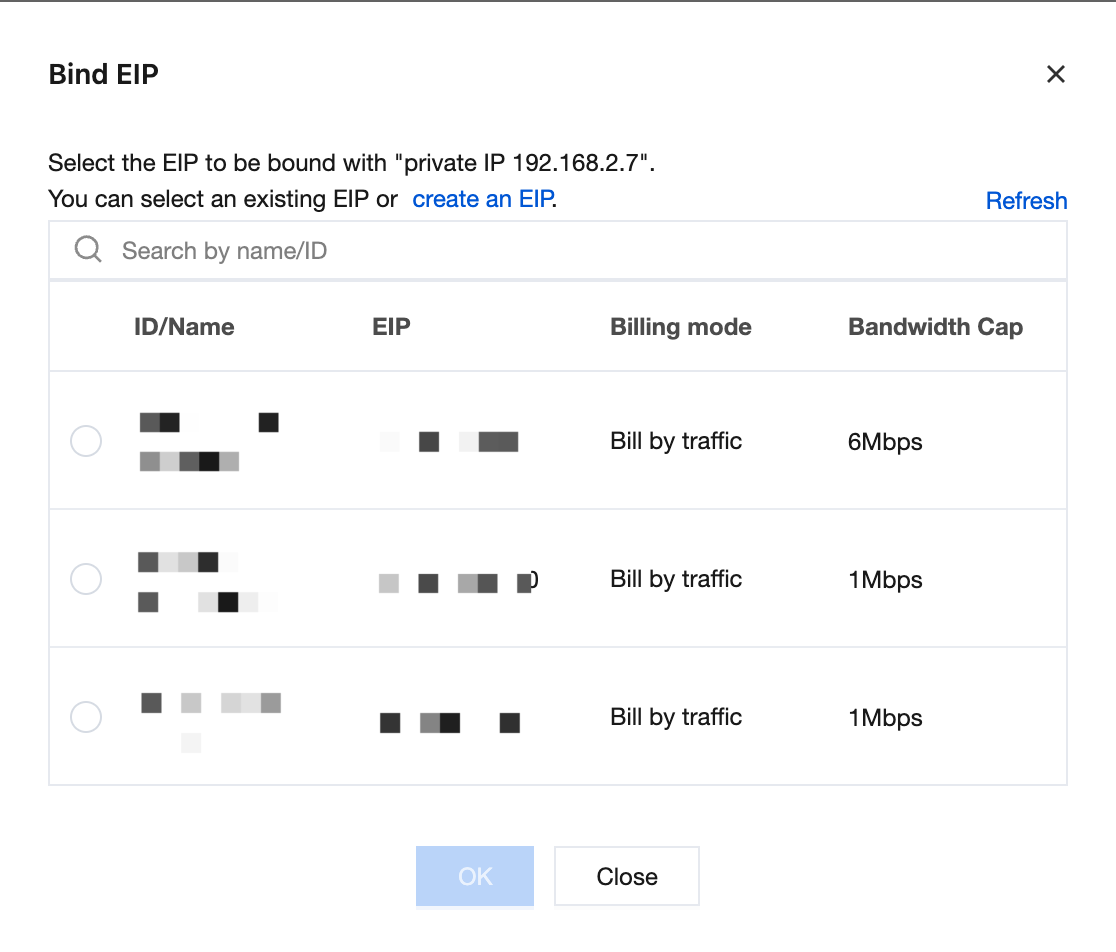 If no EIP is available, click Create an EIP at the top of the dialog box to apply for one. For details, see Applying for an EIP. After successful application, return to the dialog box, click Refresh, select the newly applied EIP, and click OK. Unbinding an EIP