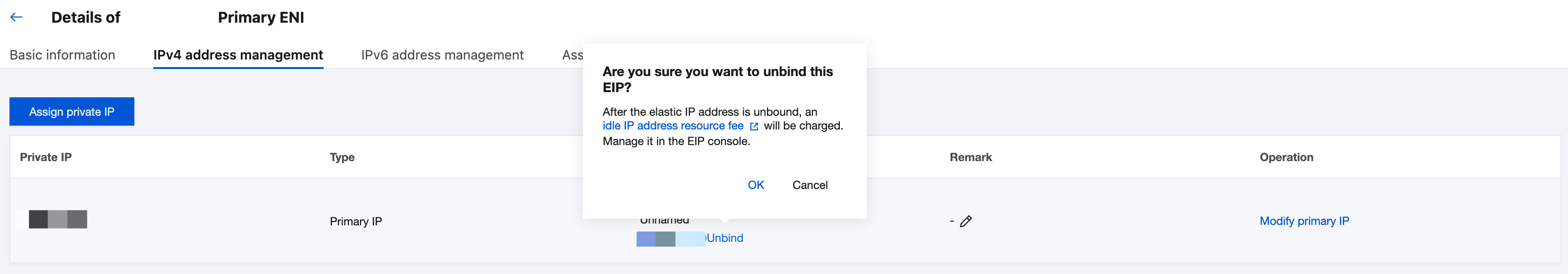 4. Locate the row of the private IP address that you want to unbind and click Unbind in the Public IP/EIP column.