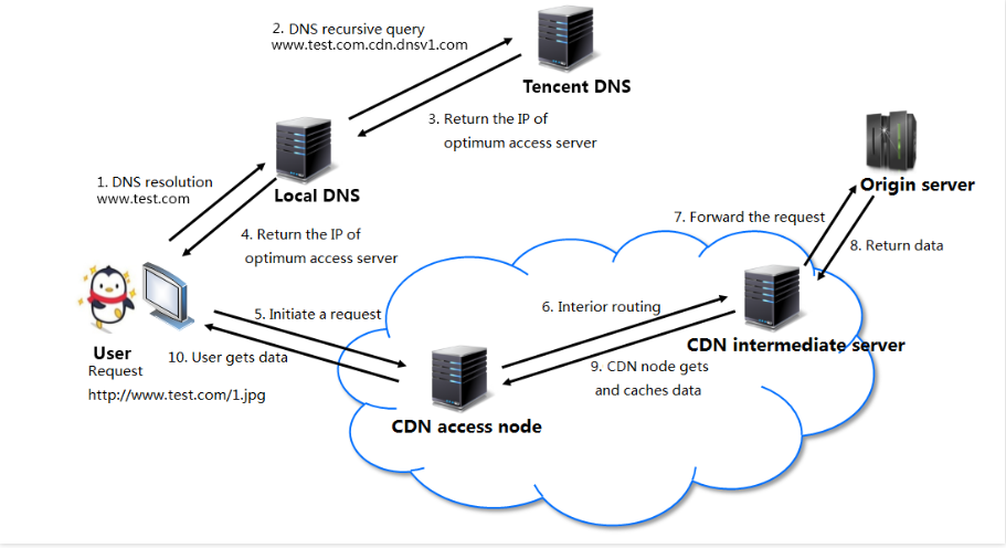 1. ユーザーがwww.test.com下の画像リソース(例:1.jpg)へのアクセス要求を送信する場合、先にLocal DNSへドメイン名解決要求を送信します。