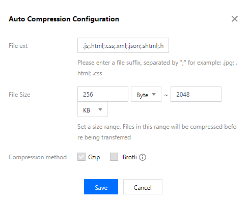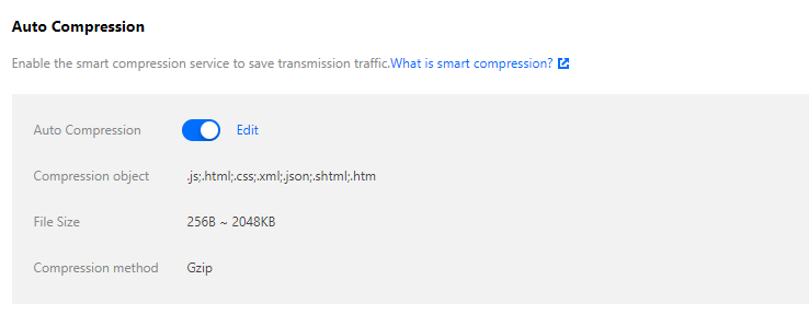 インテリジェント圧縮設定により、CDNはコンテンツを返すときに設定されたルールに従ってリソースをGZIP圧縮またはBrotli圧縮し、転送されるコンテンツのサイズを効果的に削減して、オーバーヘッドを削減します。