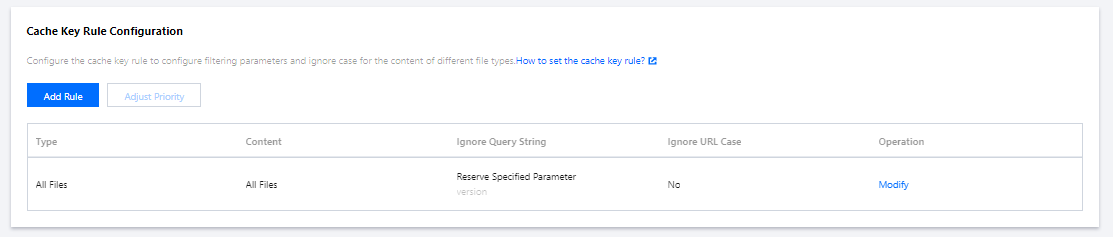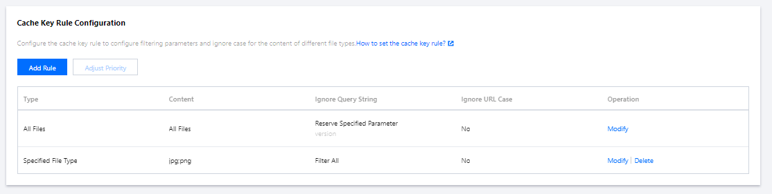 Tencent Cloud CDNは、キャッシュ時にKey-Value形式を使用してリソースをマッピングします。Keyはキャッシュキーで、キャッシュされたリソースの一意の識別子です。キャッシュキールールを設定することにより、異なるファイルタイプのコンテンツに[フィルタリングパラメータ]と、[大文字と小文字を区別しない]機能を設定して、キャッシュキーを最適化できます。