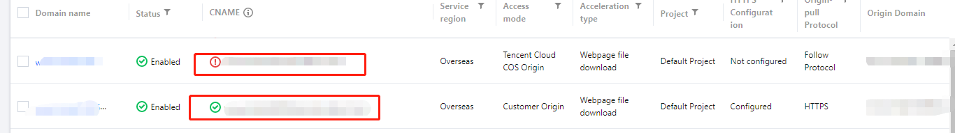 1. コンソールのドメイン名管理リストで確認できます。ドメイン名のCNAME解決が正しく行われていれば、現在CDNドメイン名のアクセラレーションが有効になっていることを意味します。CNAME解決が2つ存在する場合は、そのうちの1つだけが有効になっていれば十分です。