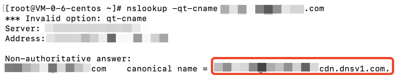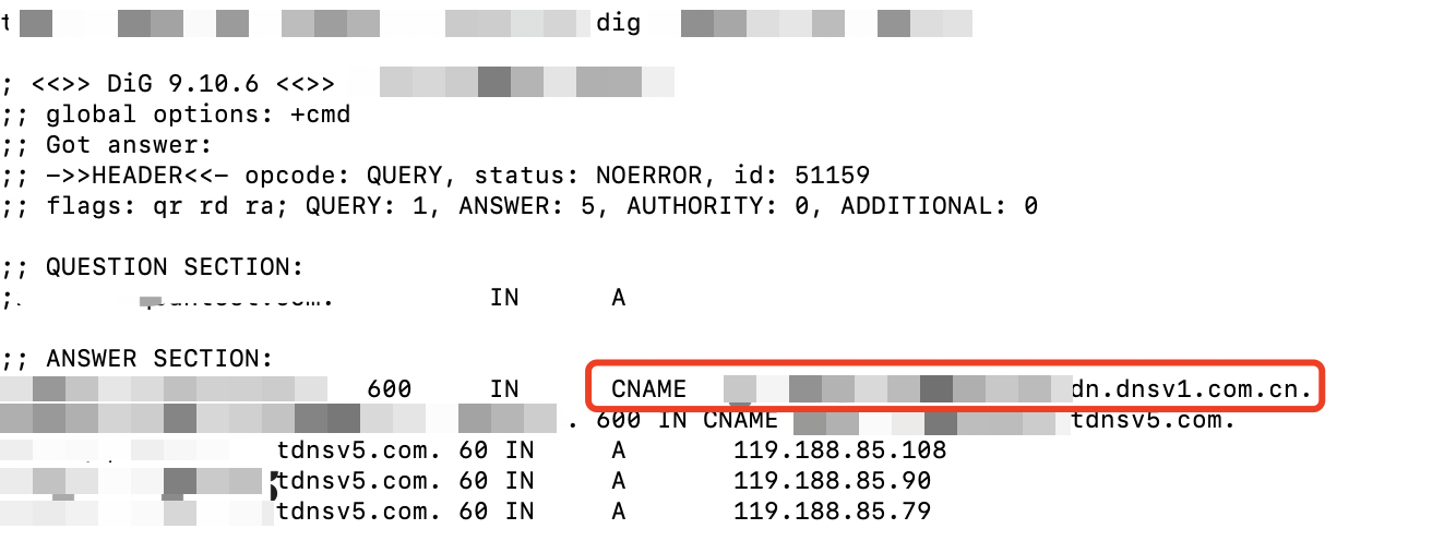 macOSまたはlinuxをご利用の場合、digコマンドを使用して確認できます。たとえばドメイン名がwww.test.comの場合、端末でdig www.test.comコマンドを実行します。実行結果では、当該ドメイン名のCNAME情報が表示されます。Tencent Cloud CDNによって提供されたCNAMEアドレスと一致する場合、現在CDNアクセラレーションが有効になっていることを意味します。