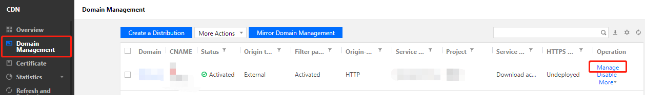 1. CDNコンソールにログインし、左側のナビゲーションウィンドウで【ドメイン名管理】を選択し、ドメイン名の右側にある【管理】をクリックして、その管理ページに入ります。
