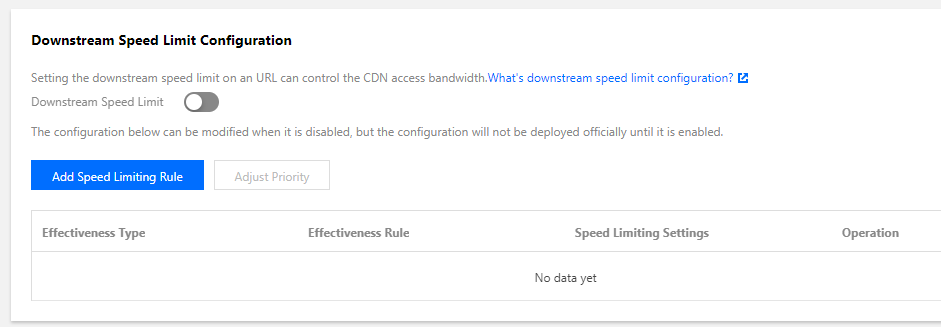 正常に最大ダウンストリーム速度を設定した場合、このドメイン名にアクセスするすべてのユーザが制限され、ユーザビリティとCDNアクセラレーションの効果にある程度影響しますので、ご注意ください。