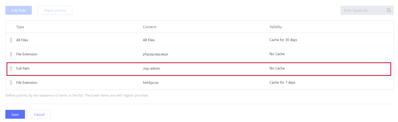 同時に複数のキャッシュルールを設定した場合、上位のルールに比べ、下位のルールの優先度が高いです。優先度を調整をクリックし、キャッシュルールをドラッグして優先順を調整することができます。