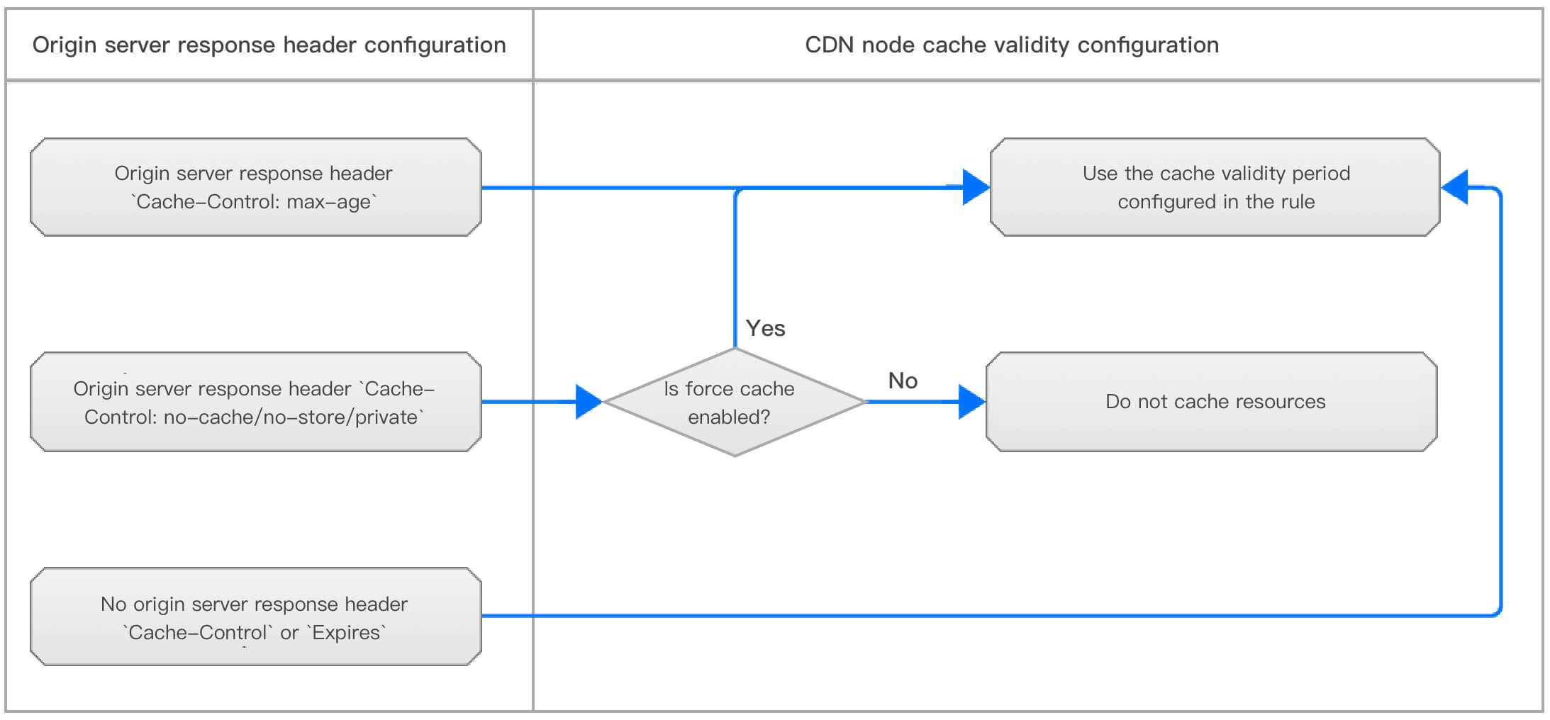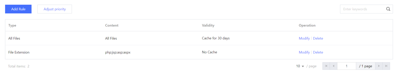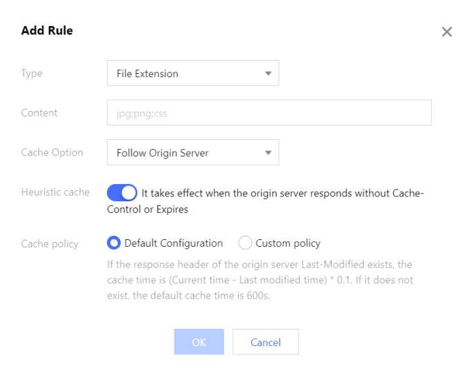 いかなるルールも設定していない場合、または、リクエストが設定されたルールをヒットしなかった場合、CDNノードでオリジンサーバーのレスポンスヘッダーCache-Controlに応じてキャッシュの有効期限を設定します。オリジンサーバーのレスポンスヘッダーにCache-Controlフィールドがない場合、CDNノードでこのリソースのキャッシュの有効期限はデフォルトで600sとします。