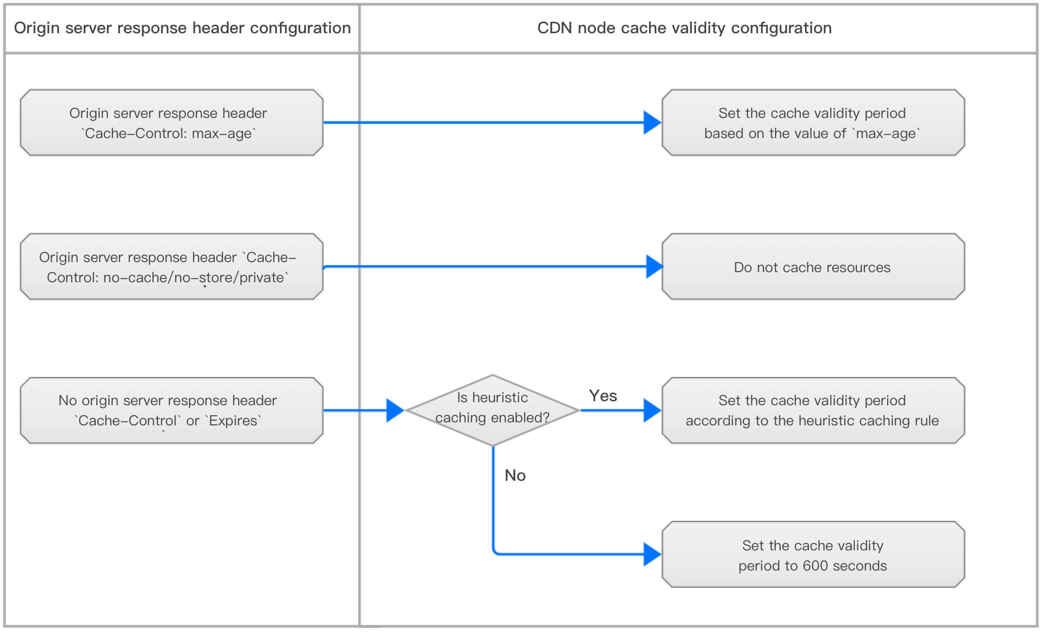 オリジンサーバーのレスポンスヘッダーにCache-ControlまたはExpiresがない場合、ヒューリスティックキャッシュの状態に応じてキャッシュルールを設定します。詳しくは以下のとおりです: