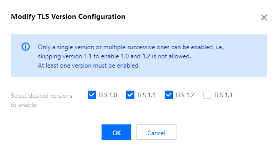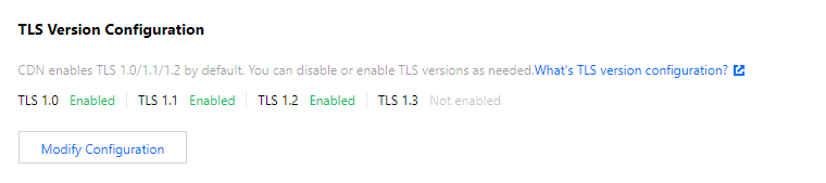 Tencent Cloud CDNは、デフォルトではTLS 1.0/1.1/1.2が有効、TLS 1.3が無効になっています。必要に応じて指定するTLSのバージョンを有効/無効にできます。