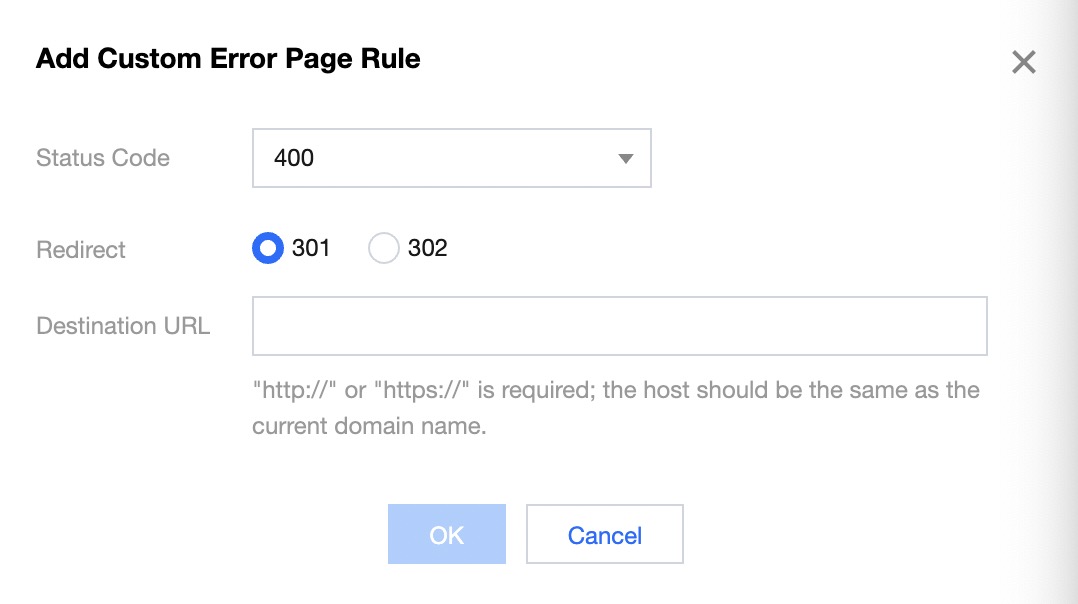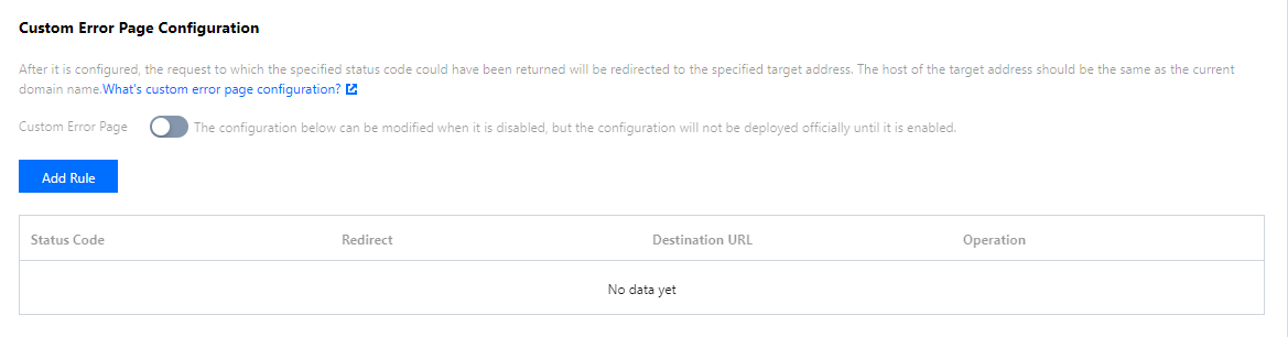 カスタムエラーページの設定機能は、必要に応じて指定されたエラーステータスコードのリクエストを指定された宛先URLにリダイレクトすることをサポートします。