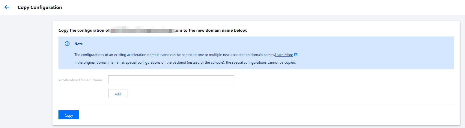 設定のコピー機能では、既存のアクセラレーションドメイン名の設定を1つ以上の新しく追加されたアクセラレーションドメイン名にコピーすることができます。 必要に応じて1つの既存ドメイン名を選択し、そのドメイン名の設定を新しく追加するドメイン名にコピーできます。これにより、新しく追加するドメイン名にコンソールのドメイン名設定を1つずつ設定する必要がなくなり、ドメイン名に簡単かつ迅速にアクセスできます。
