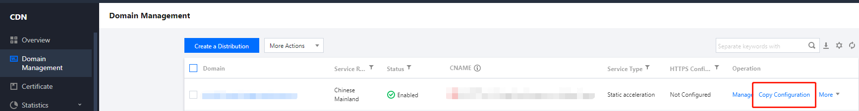 1. CDNコンソールにログインし、左側のメニューバーで【Domain Management】を選択し、ドメイン名操作列にある【設定のコピー】をクリックすると、設定のコピー画面が表示されます。