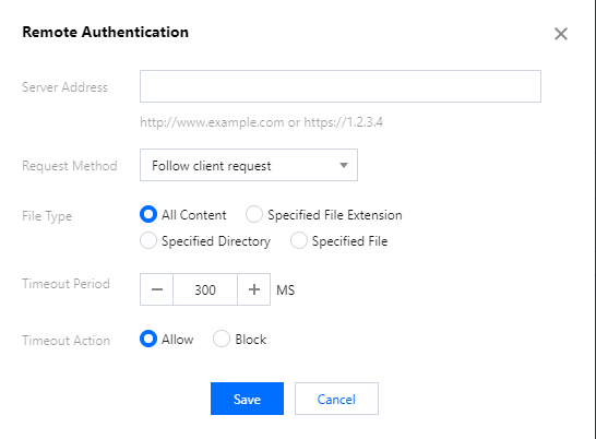 認証ファイルタイプ:認証ファイルの有効範囲を設定します。すべてのコンテンツ/指定されたファイル拡張子/指定されたファイルディレクトリ/指定されたファイルに対するリモート認証の有効化をサポートしています。