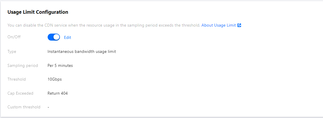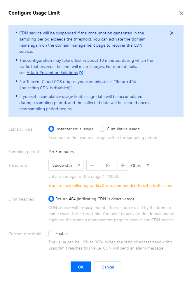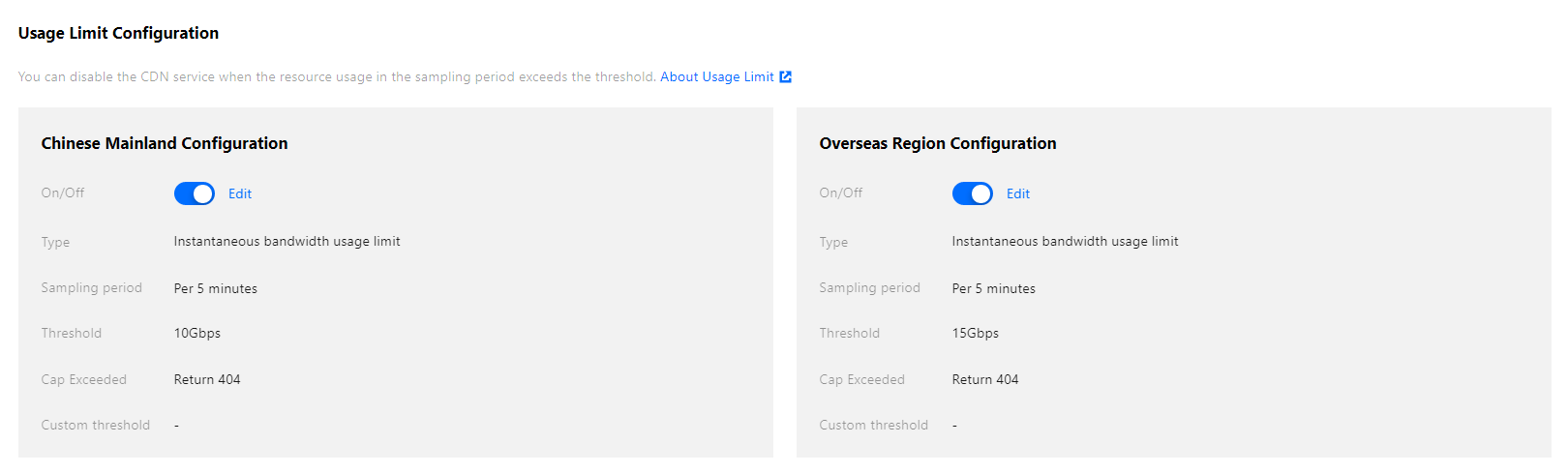 ドメイン名の帯域幅(トラフィック)がしきい値を超えたことを検出した後、アクセスが404エラーを返します。設定の有効化はネットワーク全体のノードが徐々に配信する必要があるため、有効になるまで遅延が発生する可能性があります。
