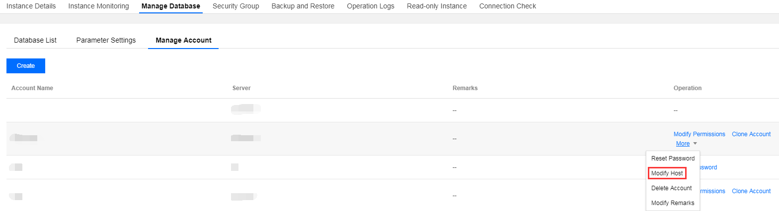 3. 【データベース管理】>【アカウント管理】タブを選択して、ホストを変更するアカウントを見つけて、【その他】>【ホストを変更】を選択します。