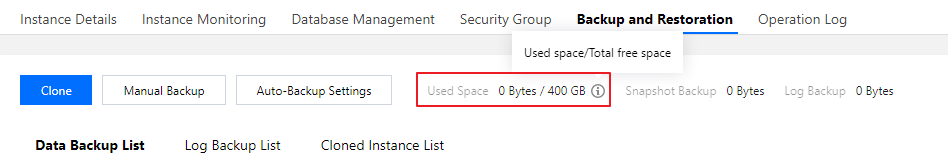 クラウドディスクバージョンのインスタンスバックアップスペースの容量は、インスタンスの[バックアップと復元]ページで確認できます。